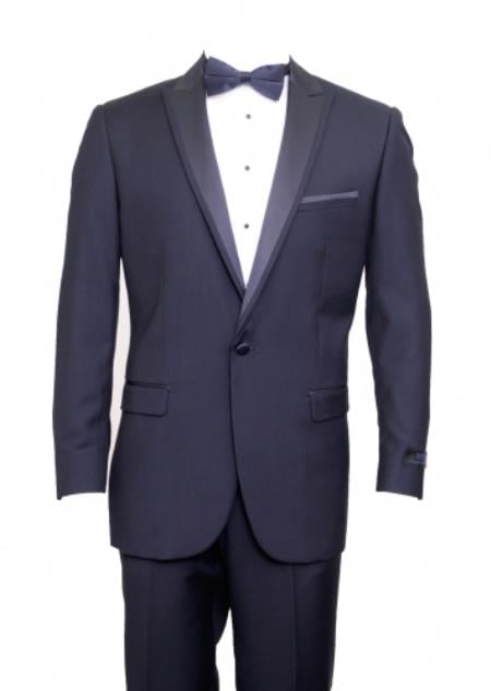 Men's Navy Flap Pocket Top Satin Trim Slim Fit Suit Peak Lapel Tuxedo Suit - Wide Lapel Tuxedo