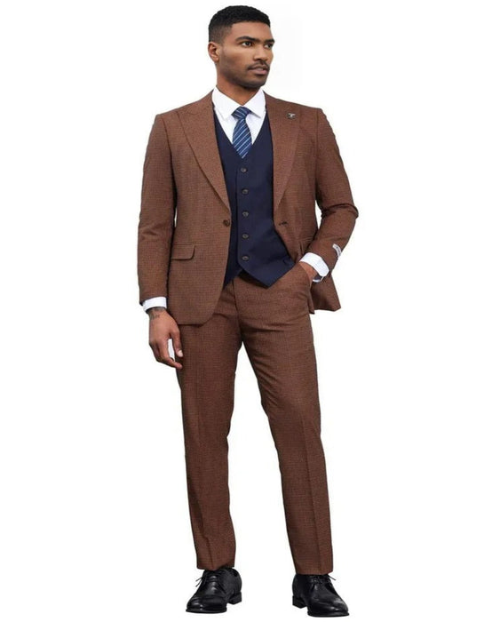 Men's Stacy Adams One Button Peak Lapel Vested Micro Check Cognac Brown Vest