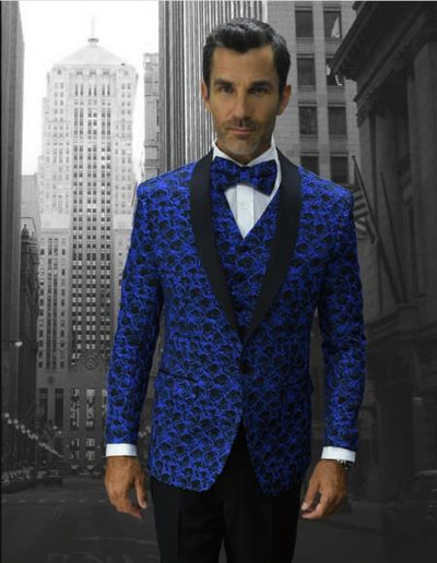 View full details1 Button Peak Lapel Single Breasted Paisley Pattern Bowtie One Chest Pocket Besom Pockets Color: Royal Blue and Gold