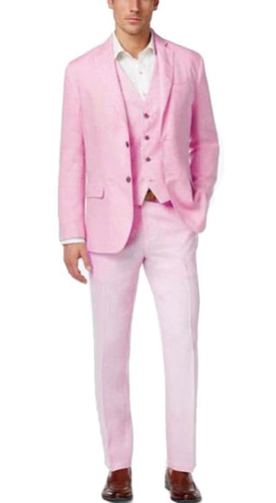 View full detailsSingle Breasted 2 Button Notch Lapel 3 Piece One Chest Pocket Flap Front Pockets Flat Front Pants Material: Linen Color: Baby Pink SKU#KA06