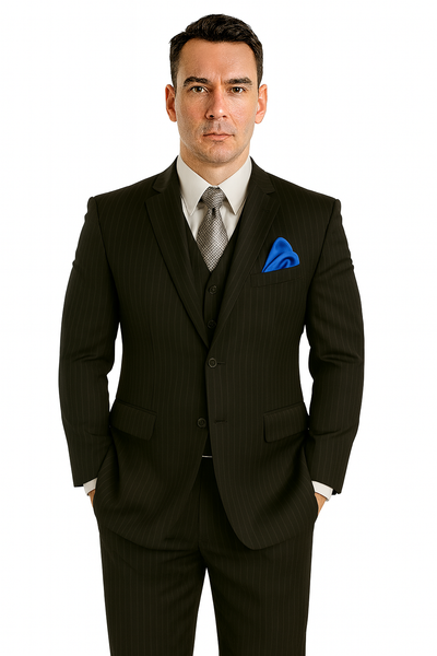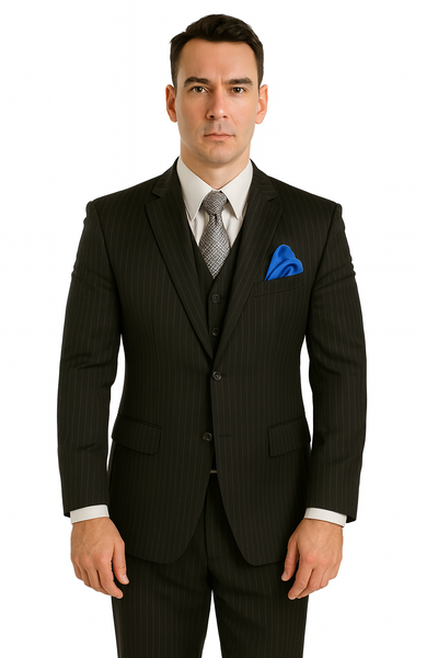 View full detailsThis men's vest suit from Tazzio Suits is all about sharp details and confident style. The striking black fabric is highlighted with bold pinstripe...