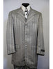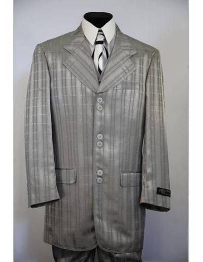 Double Breasted Button Closure Peak Lapel One Chest Pocket Flap Front Pocket 4 Button Cuffs Striped Pattern Color: Grey SKU#GD1166