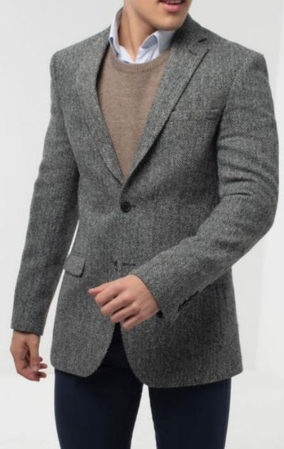 2 Button Single Breasted Notch Lapel One Chest Pocket Two Flap Front Pockets 100% Harris Tweed Center Vent Leather Buttons Color: Grey Herringbone ...