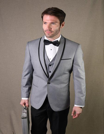 View full details3-Piece Set: Includes Jacket, Pants & Vest Color: Grey Thread Count / Feel: Super 150's Pattern: Solid Jacket Lapels: Shawl Front Buttons: 1 Ja...