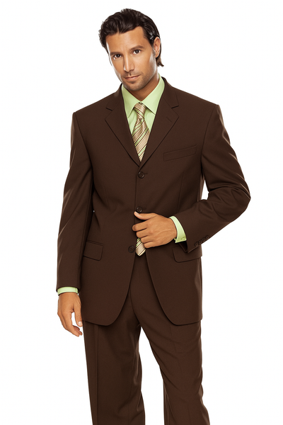 View full detailsA regular fit three piece solid brown suit with no vents and youthful looking narrow lapels. The rich solid brown color and plain weave gives a loo...
