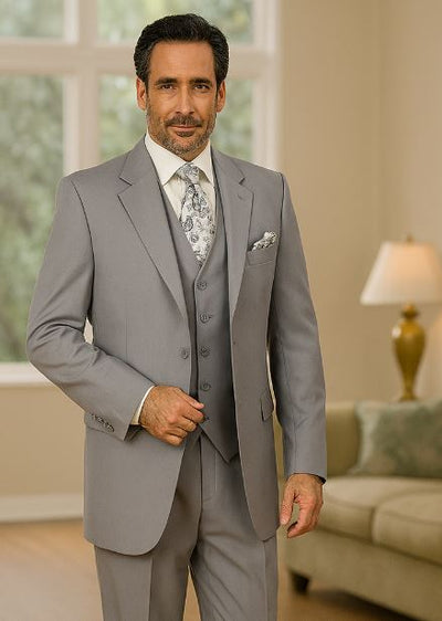 View full detailsThis classic fit 3 button suit features a notch lapel side vented jacket, matching 5 button lapelled vest, and matching single pleated pants.
