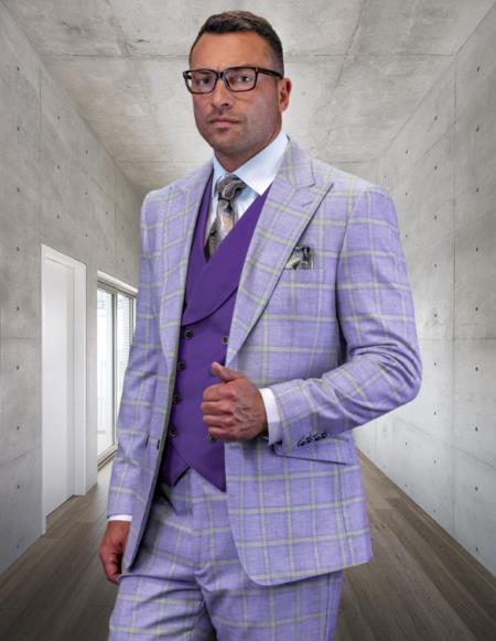 1 Button Peak Lapel Single Breasted Flat Front Pants Windowpane Pattern Besom Chest Pocket Two Flap Front Pocket Color: Lavender