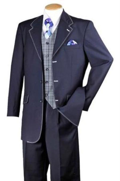 3 Buttons Notch Lapel One Chest Pocket Two Flap Front Pockets Wide leg style baggy pants Made of poly fabric Color: Navy White SKU#JA5196