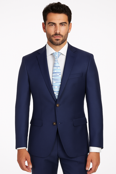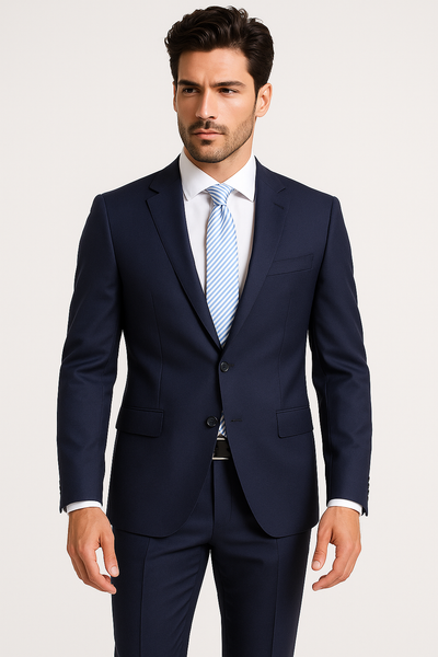View full detailsModern Fit Suit 2 Piece includes Blazer and Pants Notch Lapel, 2 Buttons, Side Vents Half Canvas Construction Bemberg Lining Flat Front Pants, Zi...
