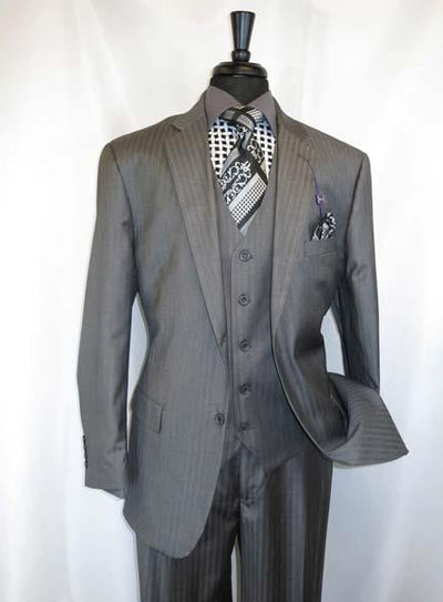 View full detailsTwo Buttons Suit Notch Lapel One Chest Pocket Flap Front Pockets Five Buttons Vested Shadow Stripe Pattern Pleated Pant Side Vents Color: Medium Gr...