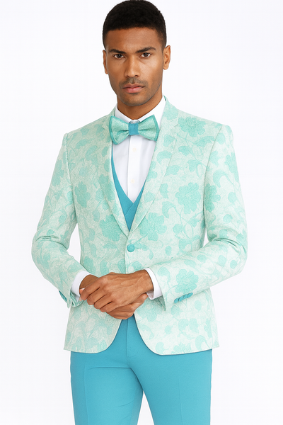 One Buttons Single Breasted Shawl Lapel Floral Tuxedo Jacket Side vents Floral Pattern One Chest Pocket Besom Pockets Matching bow tie Color: Aqua ...
