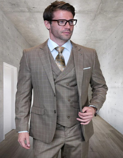 2 Button Notch Lapel Single Breasted 6 Button Double Breasted Vest Windowpane Pattern One Chest Pocket Two Flap Front Pockets Color: Tan