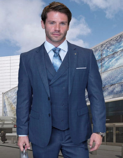 2 Button Notch Lapel Single Breasted 6 Button Double Breasted Vest Windowpane Pattern One Chest Pocket Two Flap Front Pockets Color: Indigo