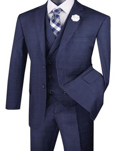 Two Button Single Breasted Notch Lapel One Chest Pocket Two Flap Front Pockets Plaid Pattern Color: Navy SKU#JA3914