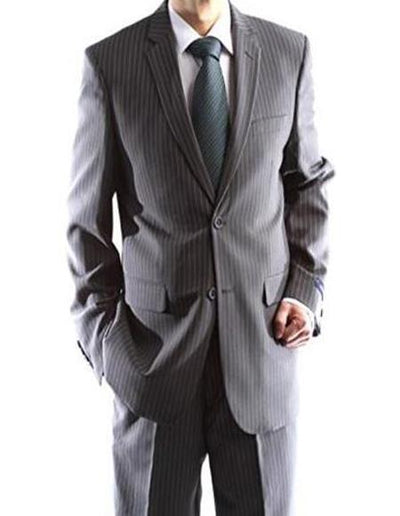 View full detailsTwo Button Single Breasted Notch Lapel One Chest Pocket Two Flap Front Pockets Pinstripe Pattern Color: Charcoal Gray