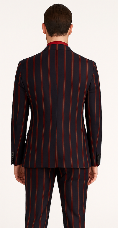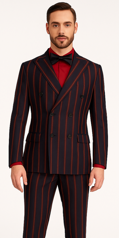 The Black and Red Pinstripe Double Breasted Suit captures the essence of bold sophistication and timeless Italian-inspired tailoring. Designed for ...