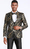 View full detailsOne Button Single Breasted Shawl Lapel One Chest Pocket Flap Two Pockets Floral Pattern Four Button Cuff Color: Black-Gold