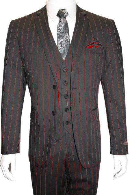 1940s Style Double Breasted Pleated Pants Bold Chalk Stripe Peak Lapel Flap Front Pockets Side Vents Poly/Rayon One Chest Pocket Color: Black/Red ...