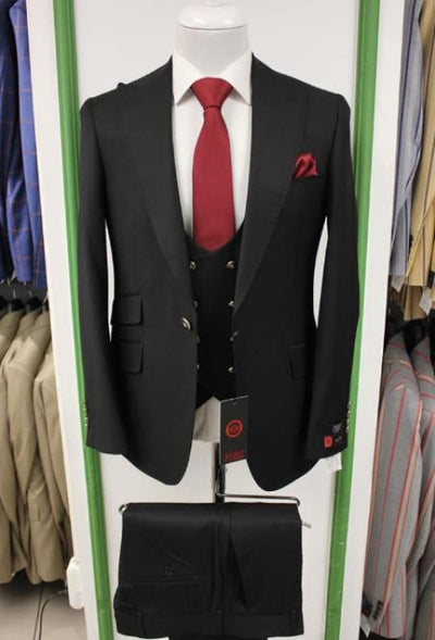 4 Button Double Breasted Peak Lapel Center Vent Slim Fit Ticket Pocket One Chest Pocket Two Flap Front Pocket Color: Black SKU#JA55501