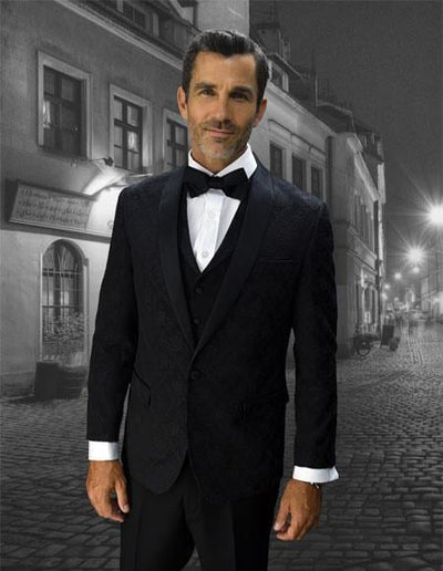 One Button Single Breasted Satin Peak Lapel One Chest Pocket Front Besom Pockets Flat Front Pants Double Vents Color : Black SKU#CH2375