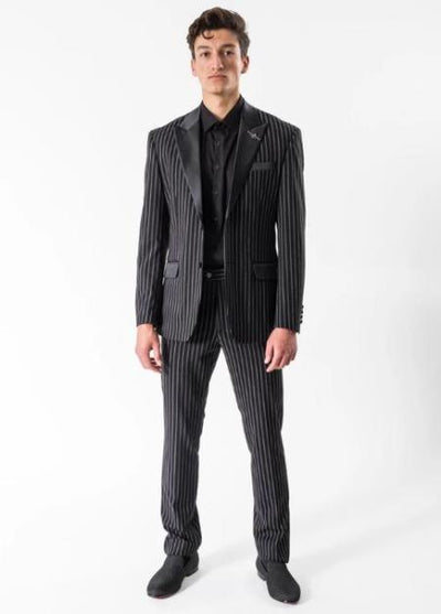Two Buttons Notch Lapel Pinstrip Pattern One Chest Pocket Two Flap Front Pockets Color: Black ~ White SKU#JA2001