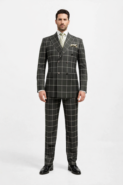 Make a bold statement with this black and white double-breasted suit, featuring a striking plaid windowpane pattern that balances classic tailoring...