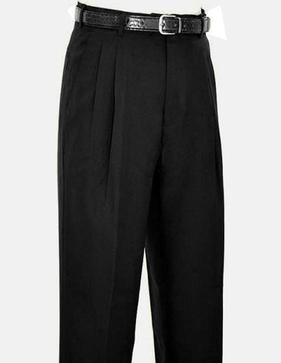 Mens Pleated Dress Pants Double Box Pleat. Four outside pockets. Back Besom Pocket With Button. Thin Belt loops. Color: Black Fabric: Rayon/P...