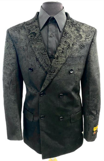 2 Button Notch Lapel Single Breasted Slim Fit Paisley Pattern One Chest Pocket Two Flap Front Pocket Color: Black