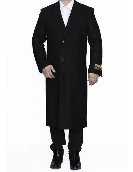 Buttons Closure Single Breasted Wide Notch Lapel 48 inch long coat Center Vent Material : 100% Wool Gabardine Color : Black SKU#CH1968