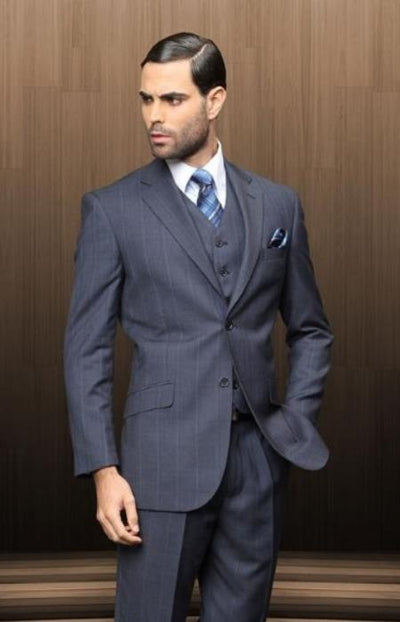 View full detailsMens navy skinny fit three piece suit with notch lapel. High end suit by Stacy Adams. Watch plaid design. This suit is made of a luxurious rayon v...