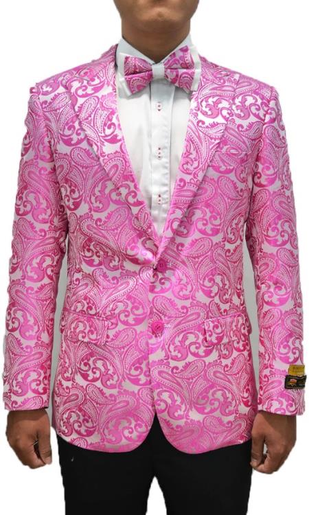 1 Button Single Breasted Peak Lapel Slim Fit Paisley Pattern Bowtie One Chest Pocket Two Flap Front Pocket Color: Pink and Blush This item is idea...