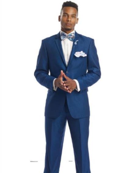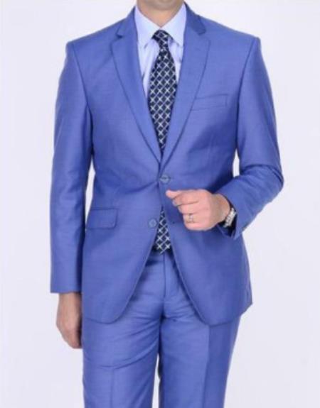 2 Button Single Breasted Notch Lapel 2 piece Slim Fit One Chest Pocket Flap Front Pockets Single Pleat Pants Material: Poly/Rayon Color: Blue SKU#J...