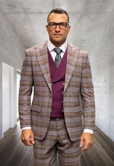 Windowpane Suit Wide Leg Pants Suit 100% Wool Suit Vested Suit 1 Button Suit Peak Lapel Suit Side Vented Jacket Plaid Pattern Modern Fit 1 Button J...