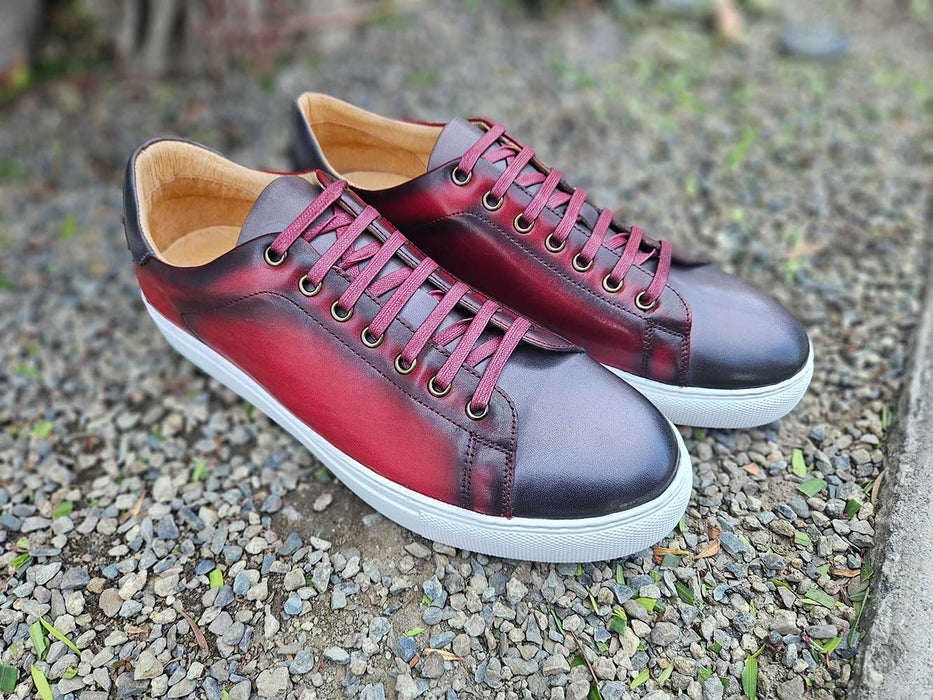 Carrucci Men's Two Tone Leather Dress Sneaker in Burgundy Gray color combo features first grain calfskin leather upper, leather lining and memory form padded footbed. The top is carefully hand-painted and burnished to create a one-of-a-kind shine. KS637-01T