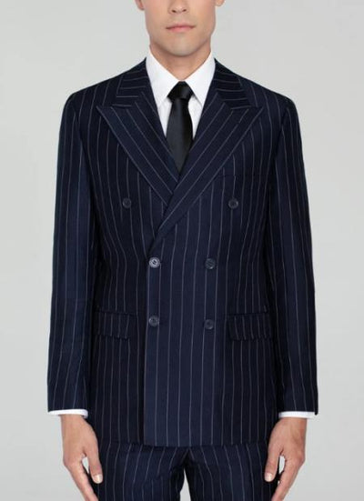 View full detailsOne Button Closure Single Breasted Peak Lapel One Chest Pocket Flap Two Front Pocket Stripe Pattern Material: Wool Color: Black SKU#JA3774