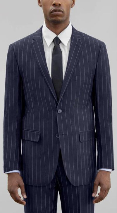 View full details2 Button Single Breasted Notch Lapel Pinstripe Pattern Slim Fit Suits Flat Front Pant Double Vent One Chest Pocket Two Flap Front Pockets Color: Bl...