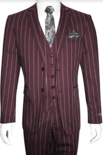 View full details2 Button Single Breasted Notch Lapel Gangster Bold Stripe Pattern One Chest Pocket Two Flap Front Pockets Color: Burgundy SKU#JA56466