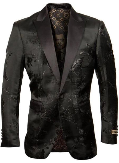 Mens Plus Size Blazers - Large Mens Blazers 1 Button Single Breasted Shawl Lapel Paisley Pattern One Chest Pocket Two Flap Front Pocket Color: Black