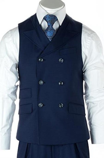 Six Button Double Breasted Peak Lapel One Chest Pocket Two Flap Front Pockets Ticket Pocket Color: Blue Wool SKU#JA1952