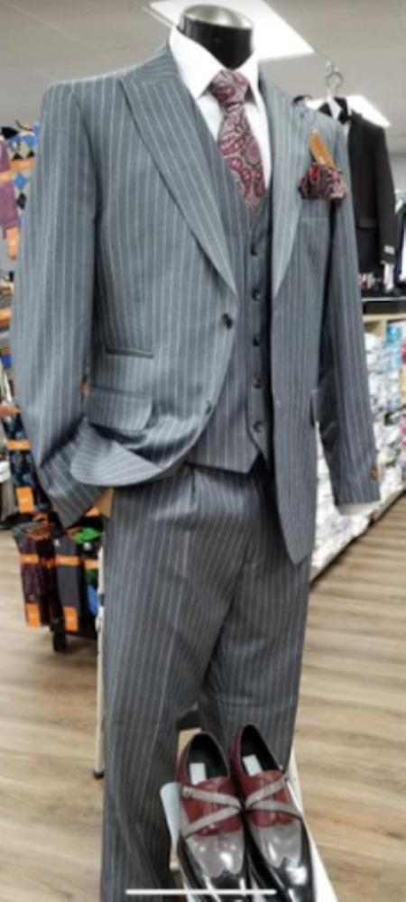 One Buttons Single Breasted Peak Lapel Pinstrip Pattern One Chest Pocket Two Flap Front Pockets Color: Gray SKU#JA2002