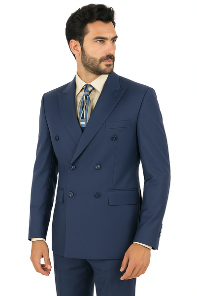 View full detailsThis suit features a classic fit 6 on 2 double breasted jacket with a wide peak lapel and side vents. The matching suit pants come in a single plea...