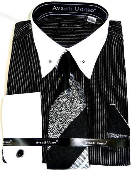 View full detailsStriped Dress Shirt French Cuff Matching Tie And Hanky Color: Black SKU#SM1290