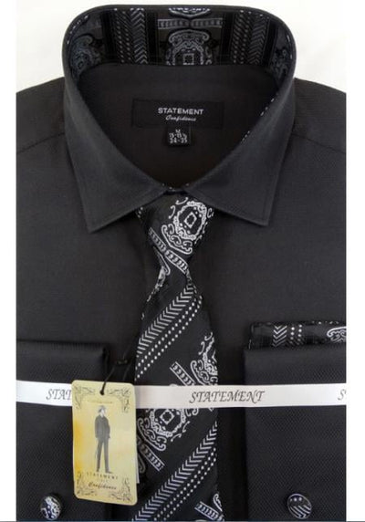 100% Cotton Statement SH-3004 Black Dress Shirts with Tie Hankie and Cuff Link Set Color: Black SKU#JA6819