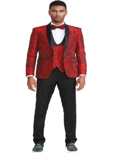 View full details1 Button Shawl Label Single Breasted Shiny Floral Pattern Slim Fit Matching Bow tie One Chest Pocket Two Flap Front Pockets Color: Red