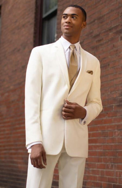2 Button Single Breasted Notch Lapel One Chest Pocket Besom Pockets Modern Fit Non-Vented Material: Polyester Color: Ivory SKU#JA7422