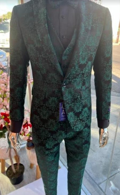 2 Button Peak Lapel Paisley or Floral Pattern Single Breasted One Chest Pocket Two Flap Front Pockets Color: Emerald Green