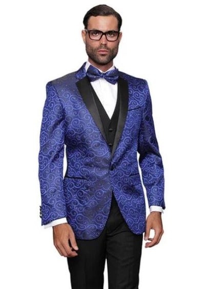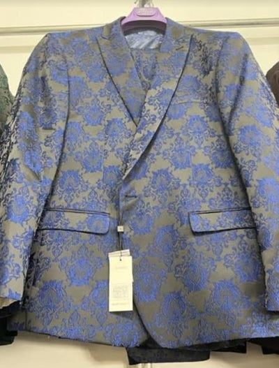1 Button Peak Lapel Single Breasted Paisley Pattern One Chest Pocket Two Flap Front Pockets Color: Royal Blue - Indigo