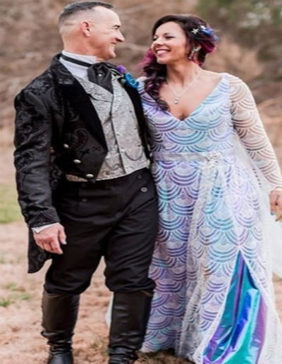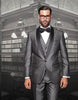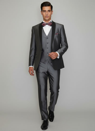 View full detailsThis men’s gray and black shawl tuxedo is a sleek slim-fitted three-piece suit tailored in a shiny two-toned sharkskin finish. Designed with a mode...