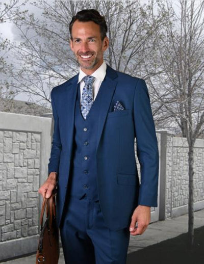 2 Button Notch lapel One Chest Pocket Flap Front Pockets Modern Fit 2 Piece Suit Color: Sapphire SKU#JA54968
