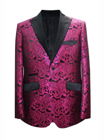 1 Button Single Breasted Shawl Lapel Paisley Pattern Modern Fit One Chest Pocket Besom Pockets Color: Hot Pink Fuchsia SKU#JA57265